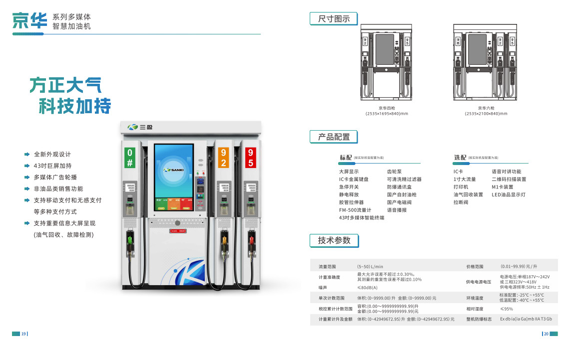 產(chǎn)品外觀功能特點(diǎn)基于大數(shù)據(jù)的網(wǎng)絡(luò)化信息化終端◎ 智能加油機(jī)已成為加油站聯(lián)系客戶的智能終端,與移動(dòng)互聯(lián)網(wǎng)、云計(jì)算、大數(shù)據(jù)、物聯(lián)網(wǎng)等信息通訊技術(shù)相結(jié)合,從而幫助加油站進(jìn)行用戶分析,向客戶提供創(chuàng)新的個(gè)性化服務(wù),吸引新老客戶,增加市場(chǎng)份額,提升加油站整體經(jīng)營(yíng)效果。 全油品支持◎ 三盈智勝系列多媒體智慧加油機(jī)配備多槍多油品,讓客戶能夠任意選擇自己需要的油品,使油站能夠有序、高效地加油。單側(cè)雙加油位,滿足兩輛車同時(shí)加油◎ 三盈智勝系列多媒體智慧加油機(jī)單側(cè)配置雙操作和雙主顯示屏,每一個(gè)操作位可選任一油槍加油,滿足兩輛車同時(shí)加油,提高加油效率。廣告宣傳功能◎三盈智勝系列多媒體智慧加油機(jī)采用32吋的高亮、防眩室外高清觸摸屏,具有廣告視頻播放功能。◎ 屏幕分區(qū)設(shè)計(jì),加油的同時(shí)也不影響視頻廣告的播放,易于油站的宣傳和展示。非油品類銷售功能◎ 三盈智勝系...